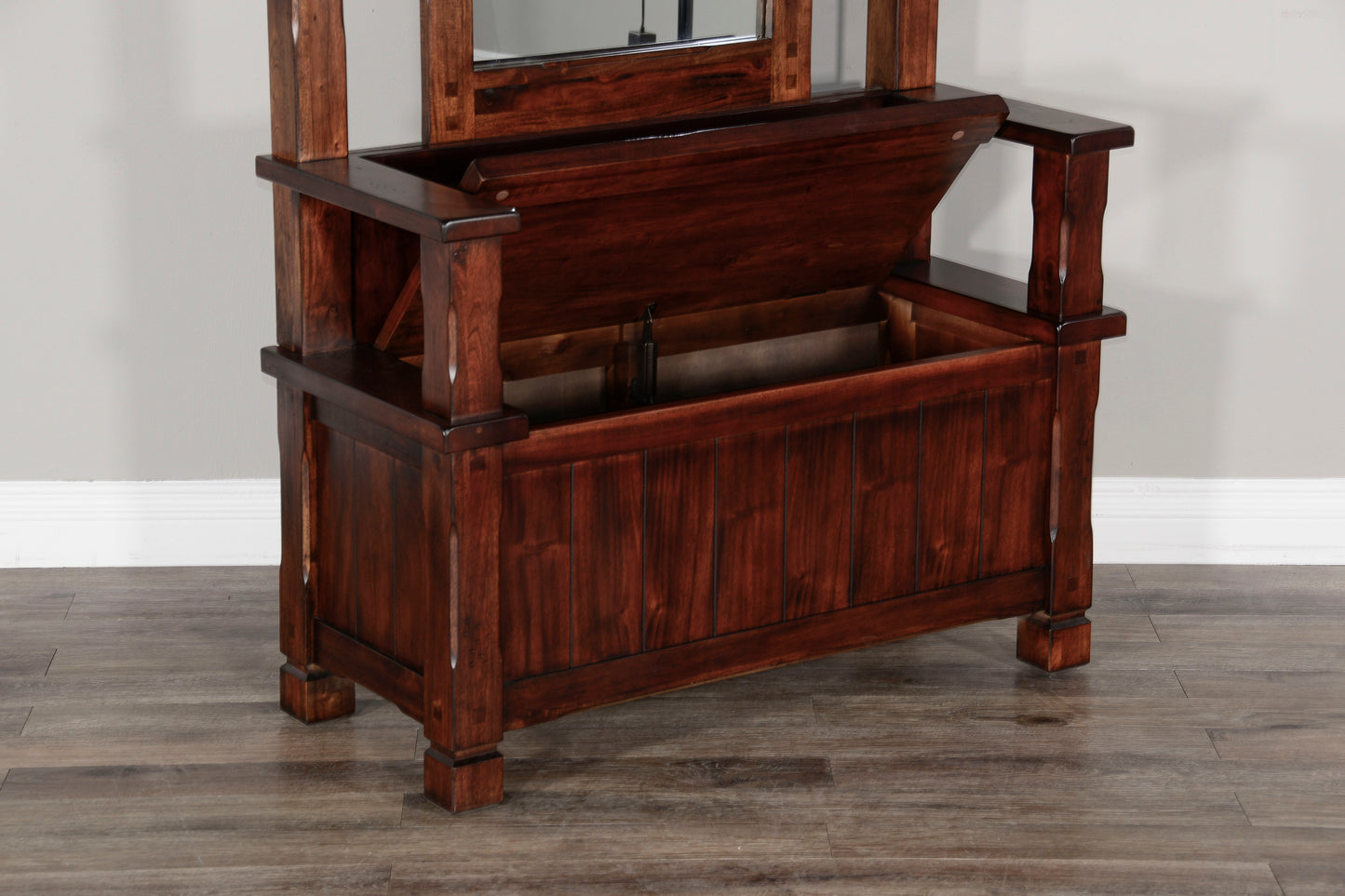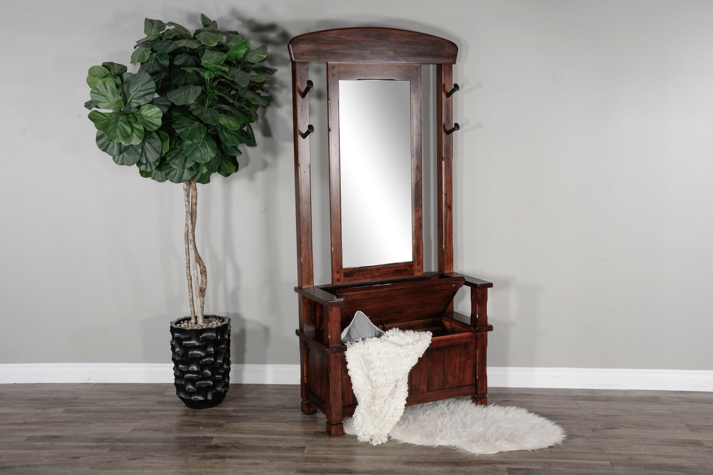 This Santa Fe hall tree was built with distressed mahogany solids and veneers, railroad spike hangers, storage under the seat and finish in a Dark Chocolate finish.
