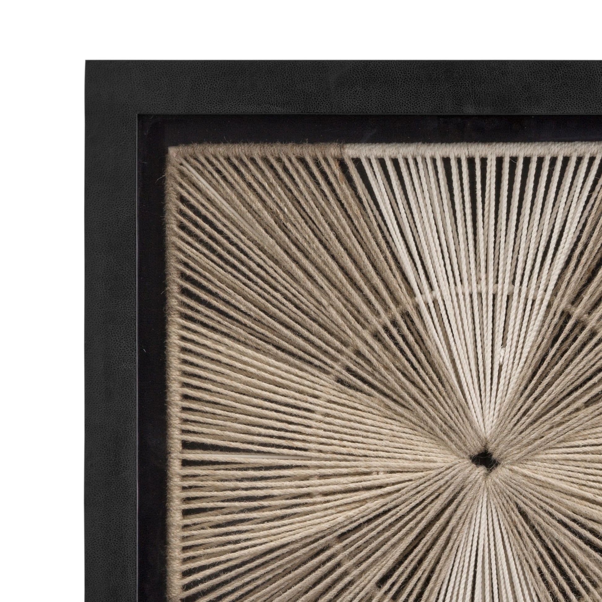 Scene Wall Art is uniquely crafted piece of art featuring woven jute in a basketweave pattern framed in a shadow box under glass in a black frame. D-ring or sawtooth picture hanging hardware included. Material: MDF, clear glass, rope, faux leather. Weight: 26 lbs. Finish: Black frame. This piece of art is hand crafted by a skilled artist lending itself to a unique technique and will vary slightly. COO: India.