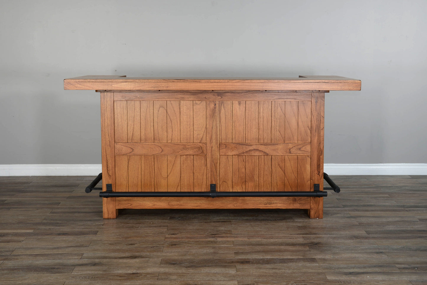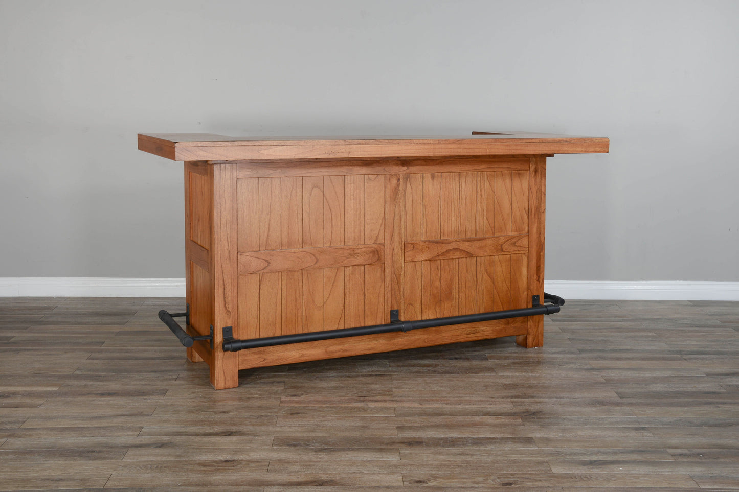 The Sedona 80" Bar is the perfect addition to any home. Built with mindi solids and veneers, with features like storage for wine bottles, under top pull-out tray, and metal foot rail.