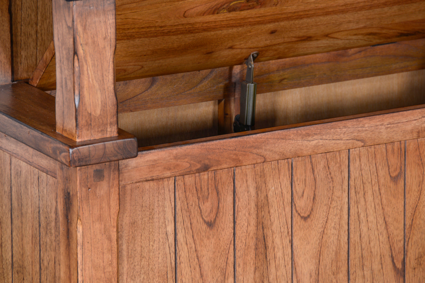 This Sedona hall tree was built with distressed mahogany solids and veneers, railroad spike hangers, storage under the seat and finish in a Rustic Oak finish.