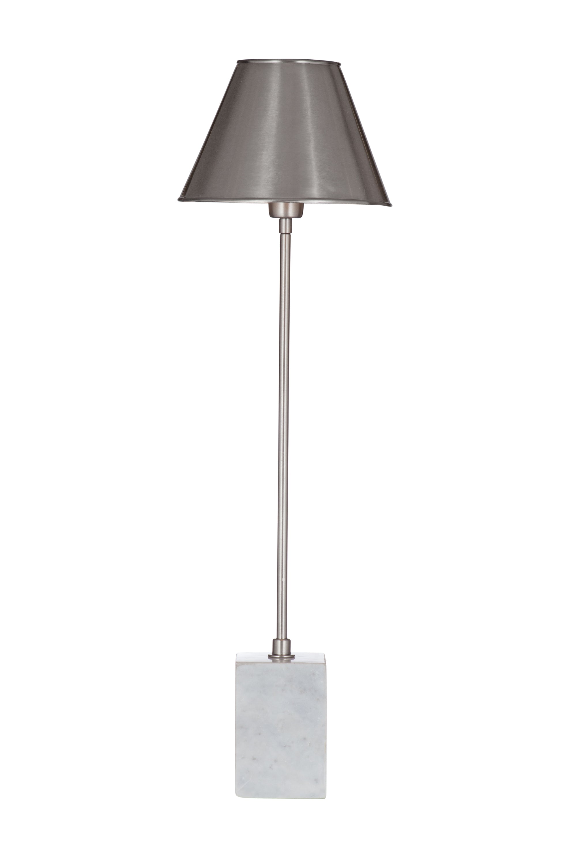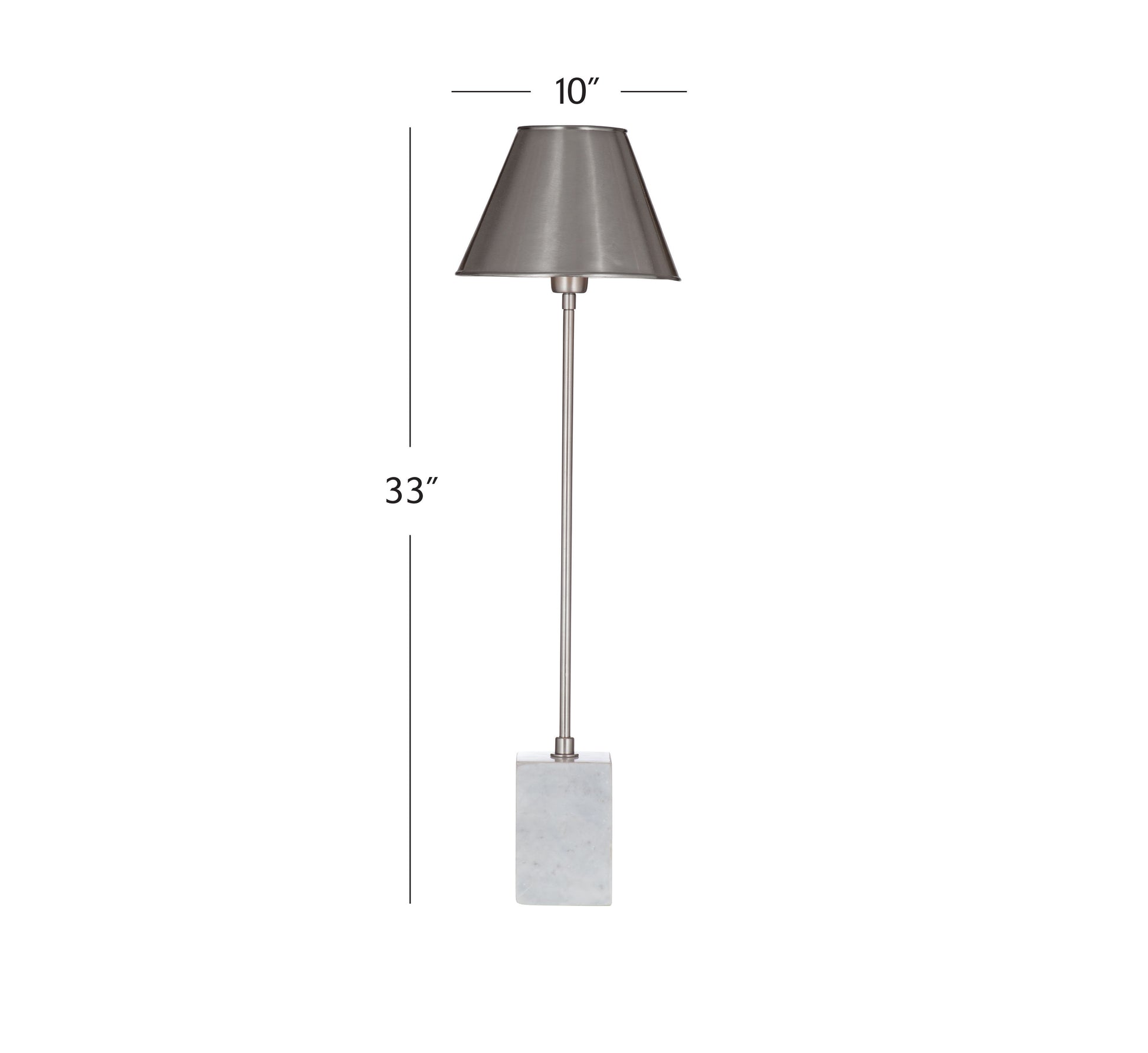 The Silver Table Lamp is crafted of metal and marble with a tapered metal shade. Finish: white marble, silver. Material: marble, metal. Wattage: 100W Max. Bulb Type: A. Socket Type: E26. Switch Type: 3 way. The hand crafted details produced by a skilled artist lends itself to a unique technique and will vary slightly. COO: India.