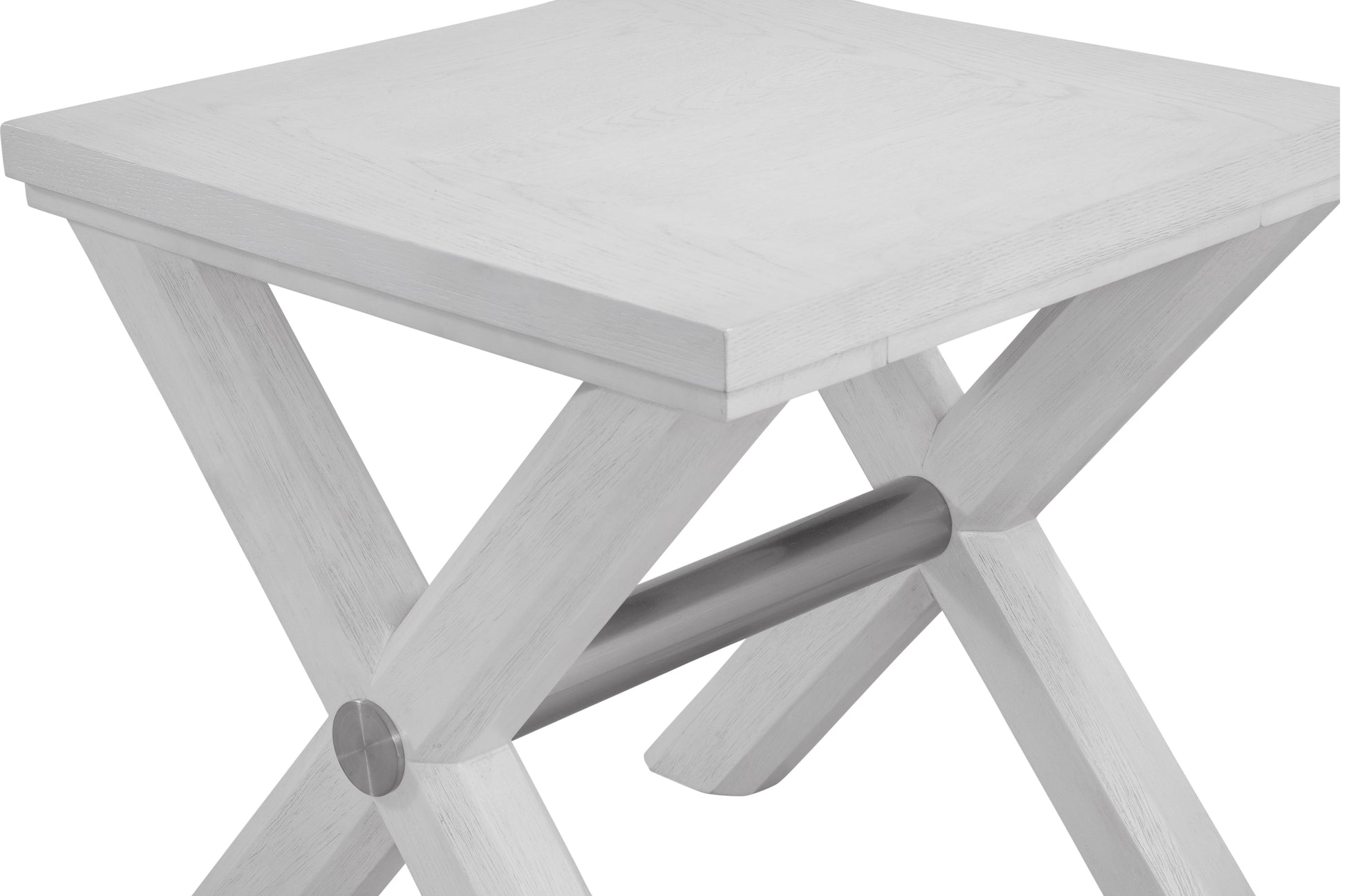 The Nadine End Table features a coastal contemporary inspired design constructed with solid wood and veneers in a bright white oak finish. The table base features a heavy octagonal shaped X-base and a brushed nickel finished metal cross-bar. Finish: bright white, brushed nickle. Material: solid wood, wood veneers, metal..