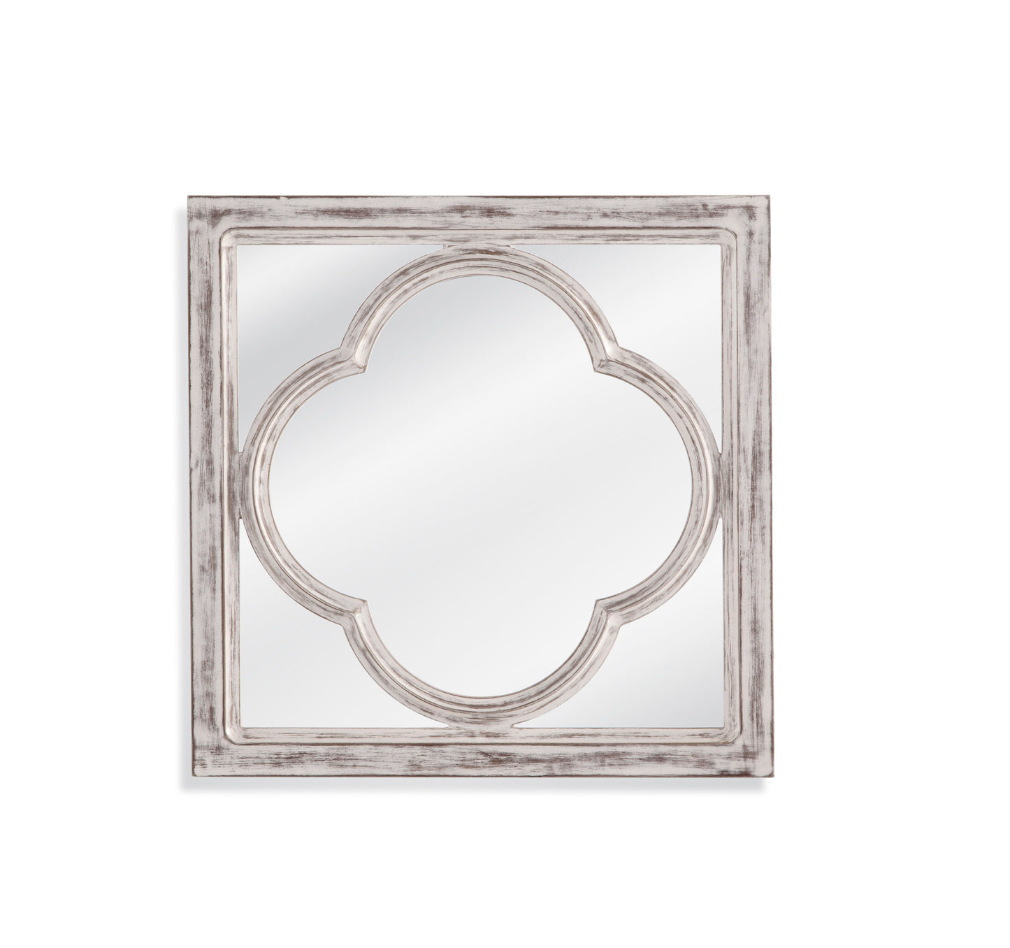The Sutter Wall mirror incorporates the popular quatrefoil design overlaid on clear mirror. It is finished in distressed white and makes a statement wall hung as multiples.
