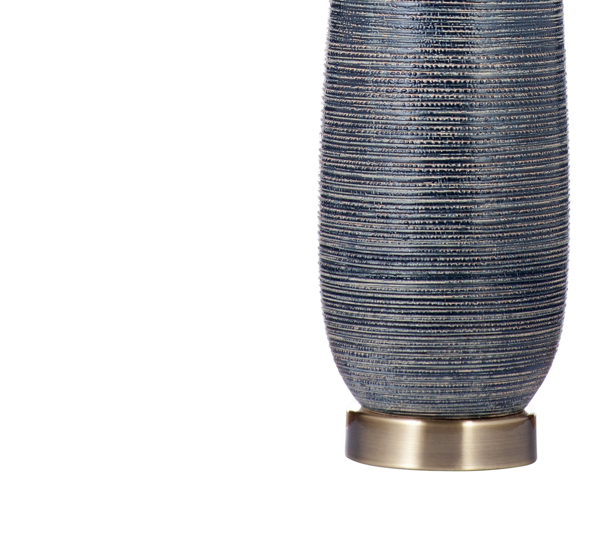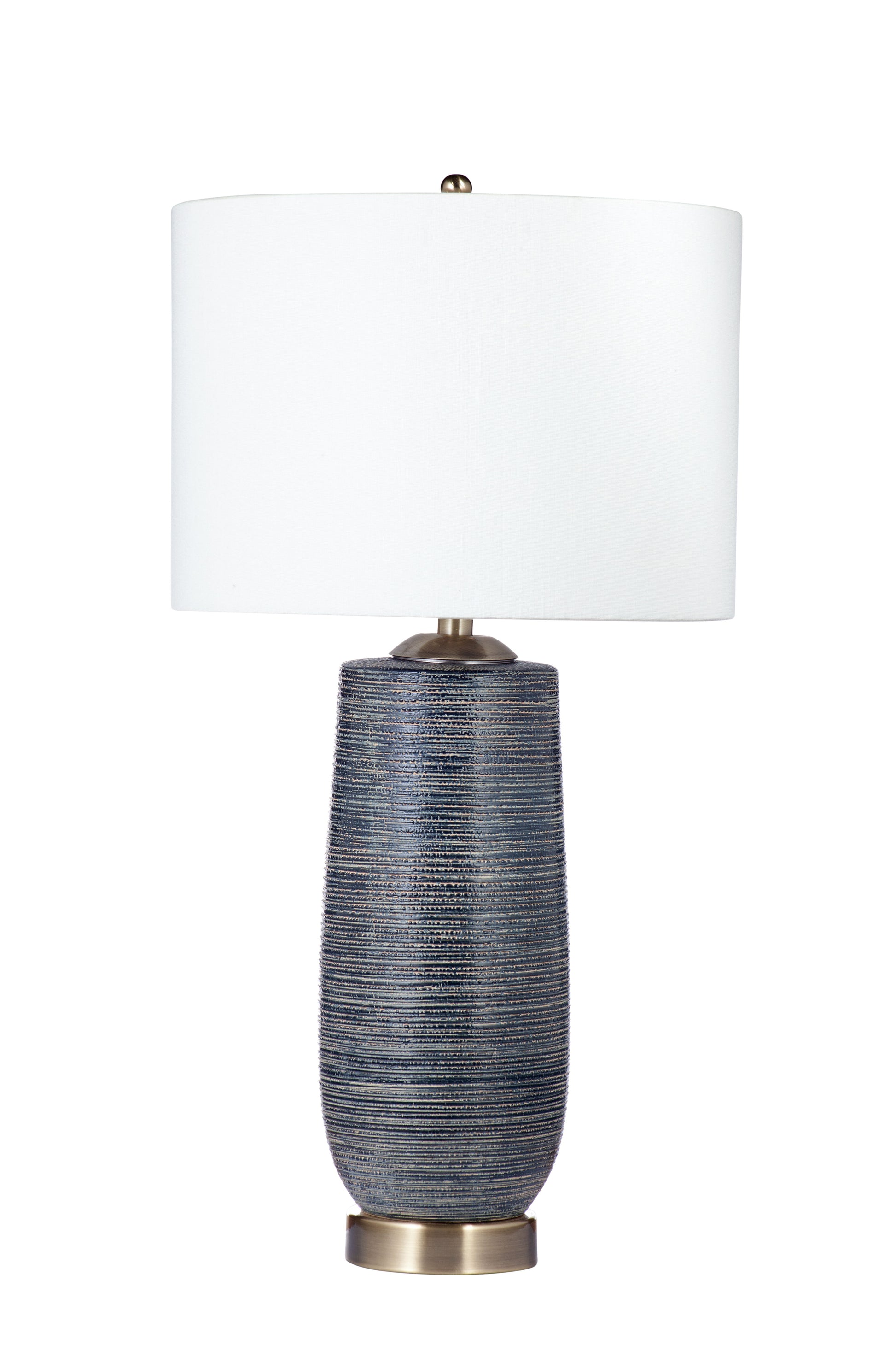 The Tampant Table Lamp is crafted of ceramic with an oatmeal drum shade. Finish: textured brown, brass. Material: ceramic. Wattage: 100W Max. Bulb Type: A. Socket Type: E26. The hand crafted details produced by a skilled artist lends itself to a unique technique and will vary slightly. COO: China.