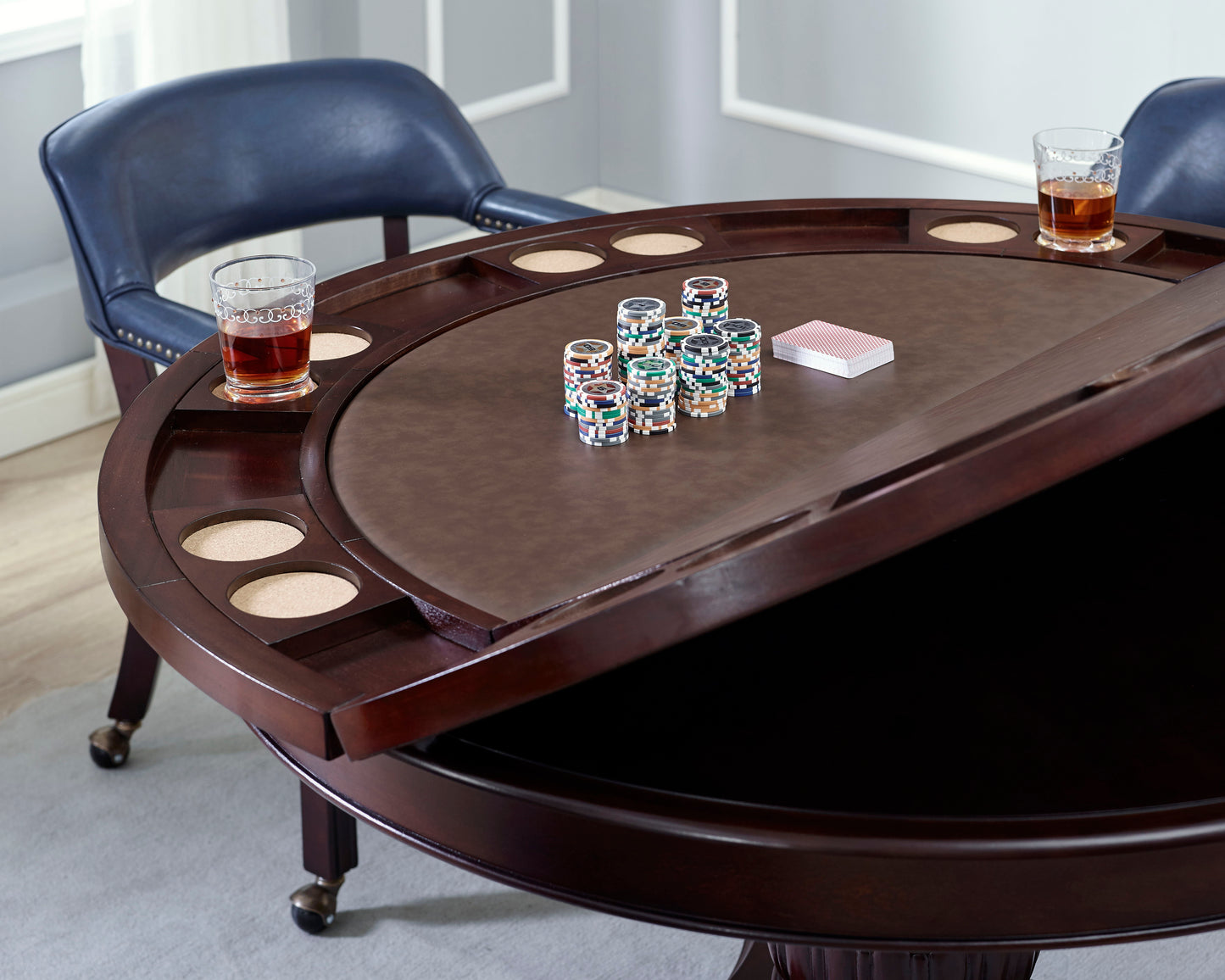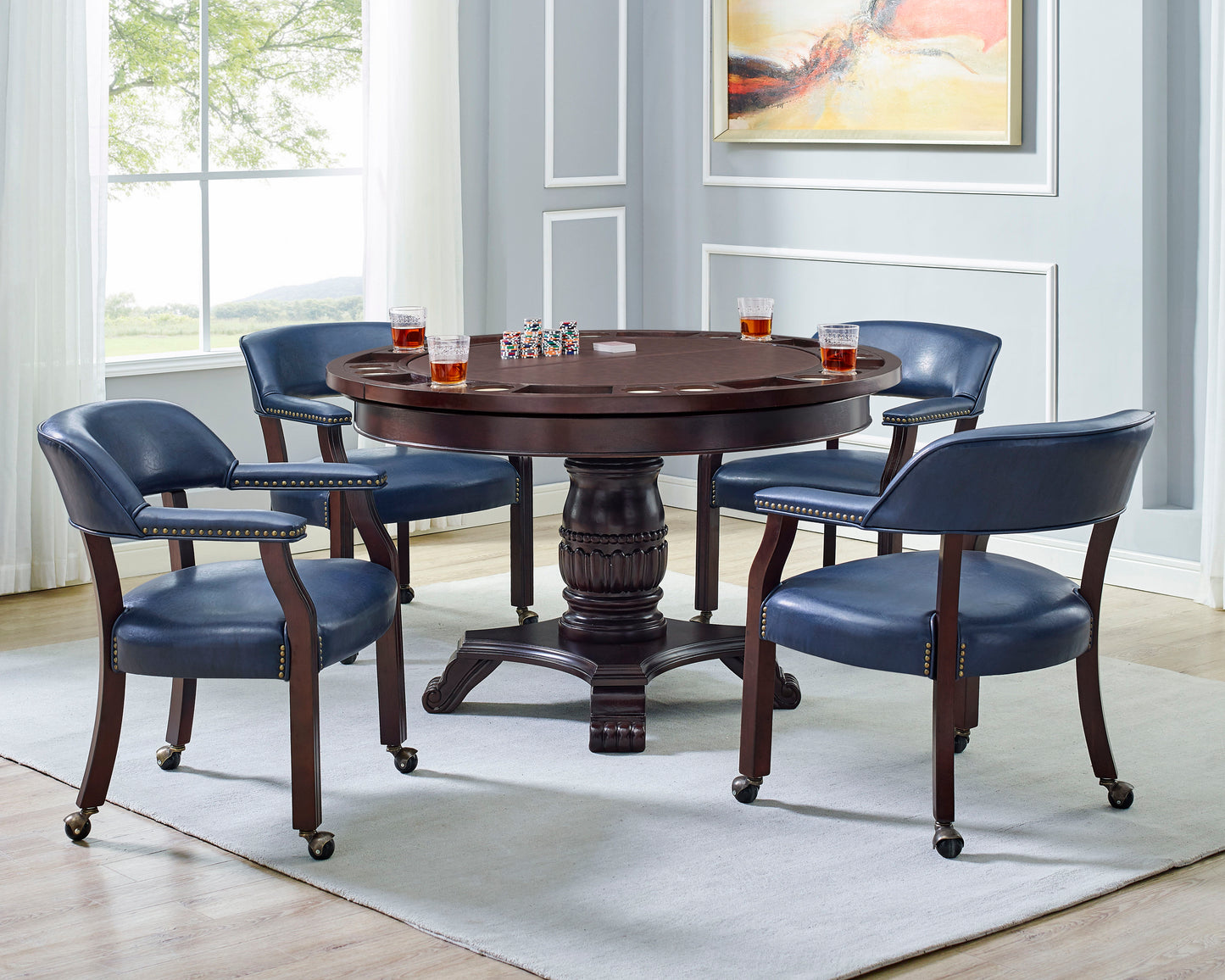 A Game Table and Chairs make both game night and dining night enjoyable! Enjoy both with the Tournament dual-purpose dining and game table. The 48-inch round table comes in a medium cherry finish and can accommodate four comfortably for dining. The dining table easily converts to a game table with the addition of the game table top that is available in faux-leather or leatherette. The game top folds and stores easily and the table goes back to a dining table. The upholstered.captain’s chair is castered for easy mobility and comes in a wide range of colors perfect for every decor.