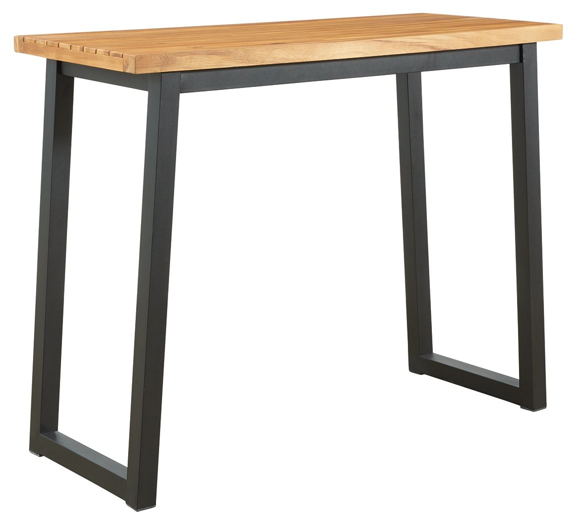 Bring an uptown feel to an outdoor space with this outdoor furniture set. An especially smart choice for small spaces, this ultra-cool counter height outdoor table and bar stool set a new standard in outdoor living. The tabletop and seats are richly crafted of acacia wood with wonderful tonal variation. Tubular steel legs are sleek, sturdy and slightly canted for an interesting angled effect.