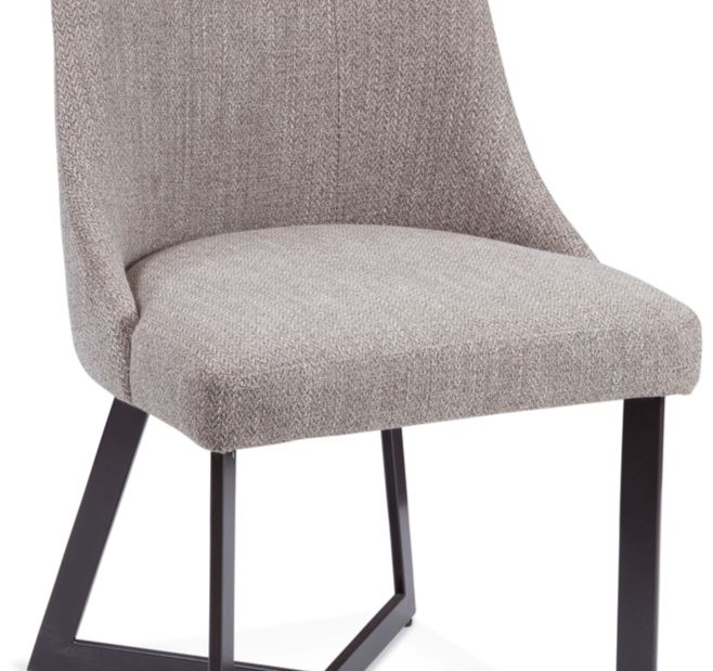 The Trucco Side Chair is a modern transitional design with angled legs and an X detail base. Finishes include bronze powder coated legs and a taupe upholstered solid back and seat. Drive in floor glides on the leg bottom and high density foam seat cushion are added features.