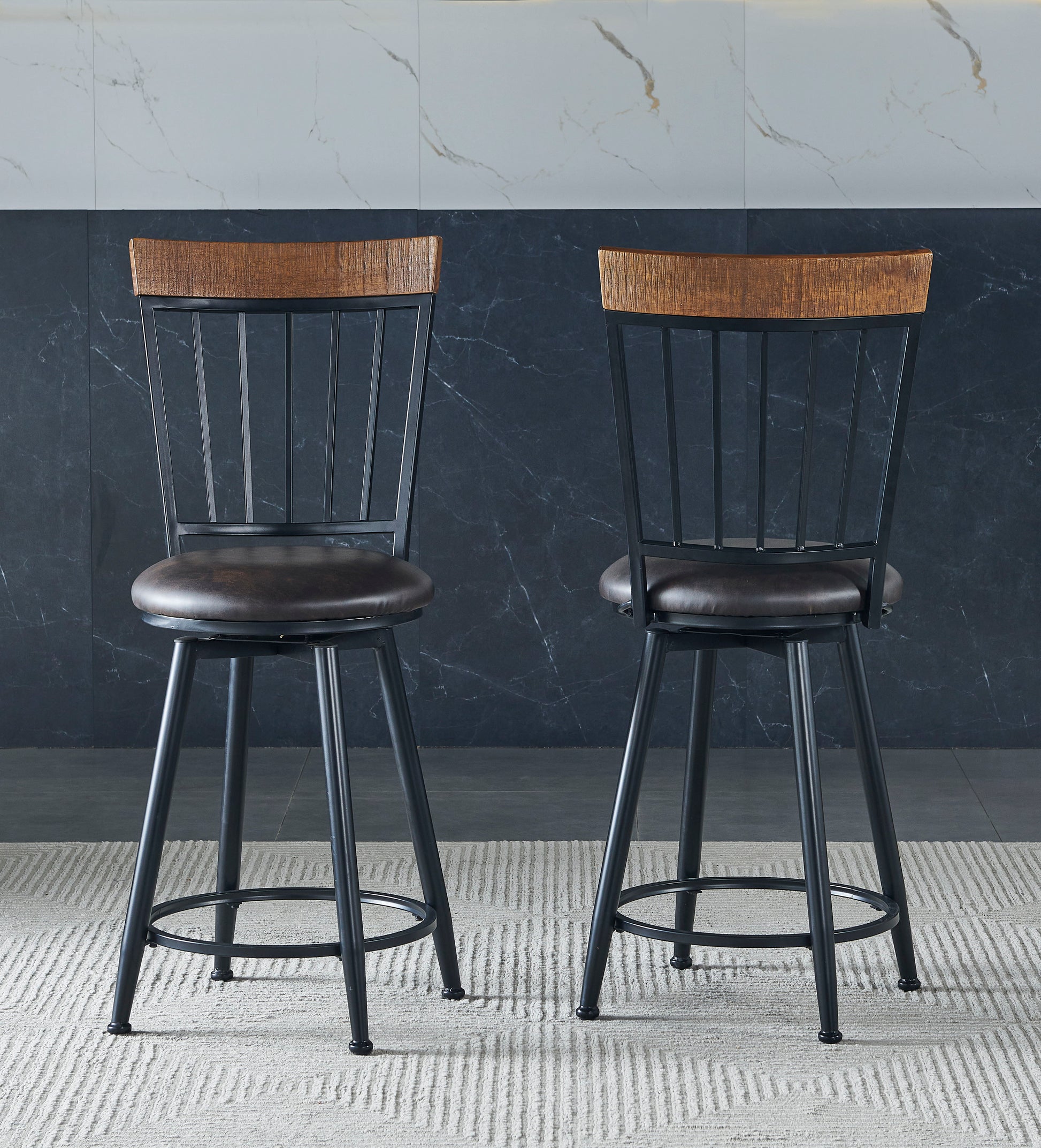 Rustic charm in a 24-inch Counter Stool built for the Tyler Bar but also comfortable in other settings. The Tyler Counter Stool offers 360 degree swivel with a padded, eacy-care black leatherette seat that cleans with the wipe of a damp cloth. A durable electrostatic painted iron base means you won’t have to worry about chips or scratches and can just enjoy the beautiful styling of the solid birch top rail. An included footrest completes the package to make a great chair for any 36-38 inch high counter.