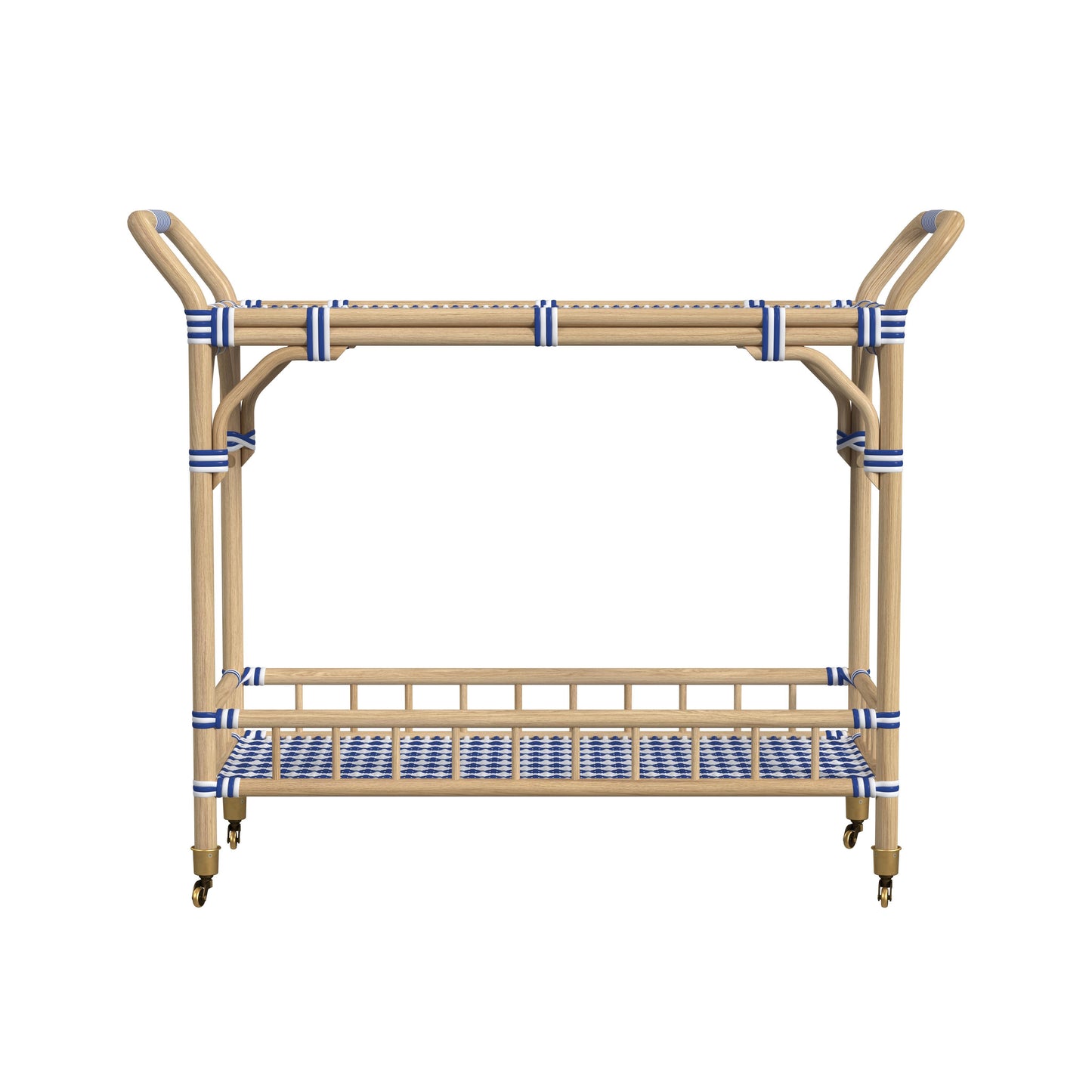 - The blue and white rattan weaving give the Ventana Bar Cart a coastal style