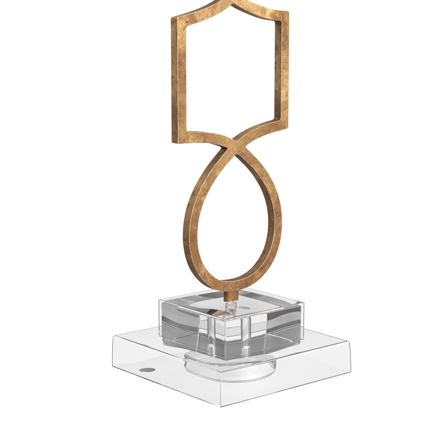 - Constructed with a lucite base, antiqued gold metal body and gold leaf finished lamp shade