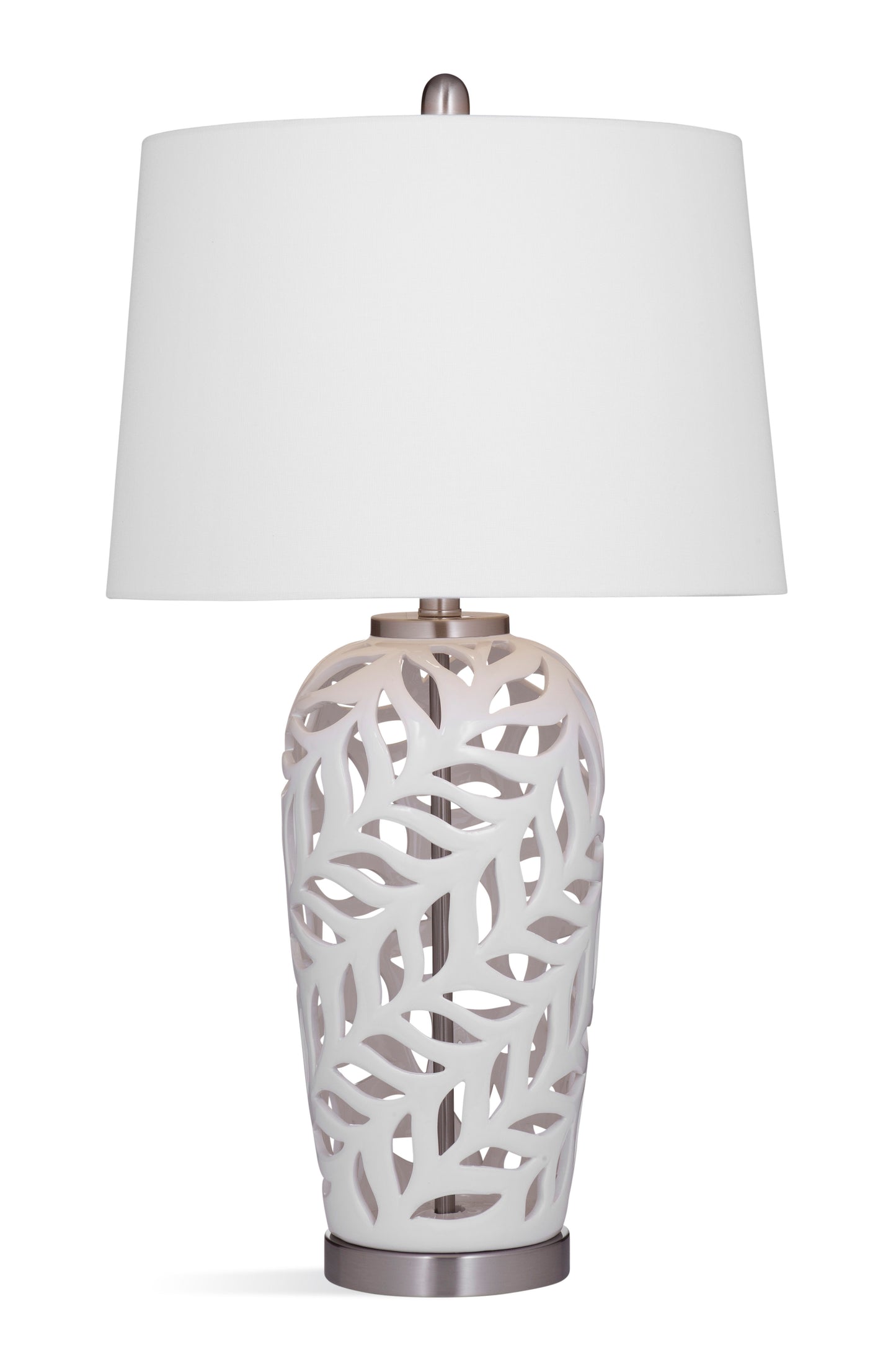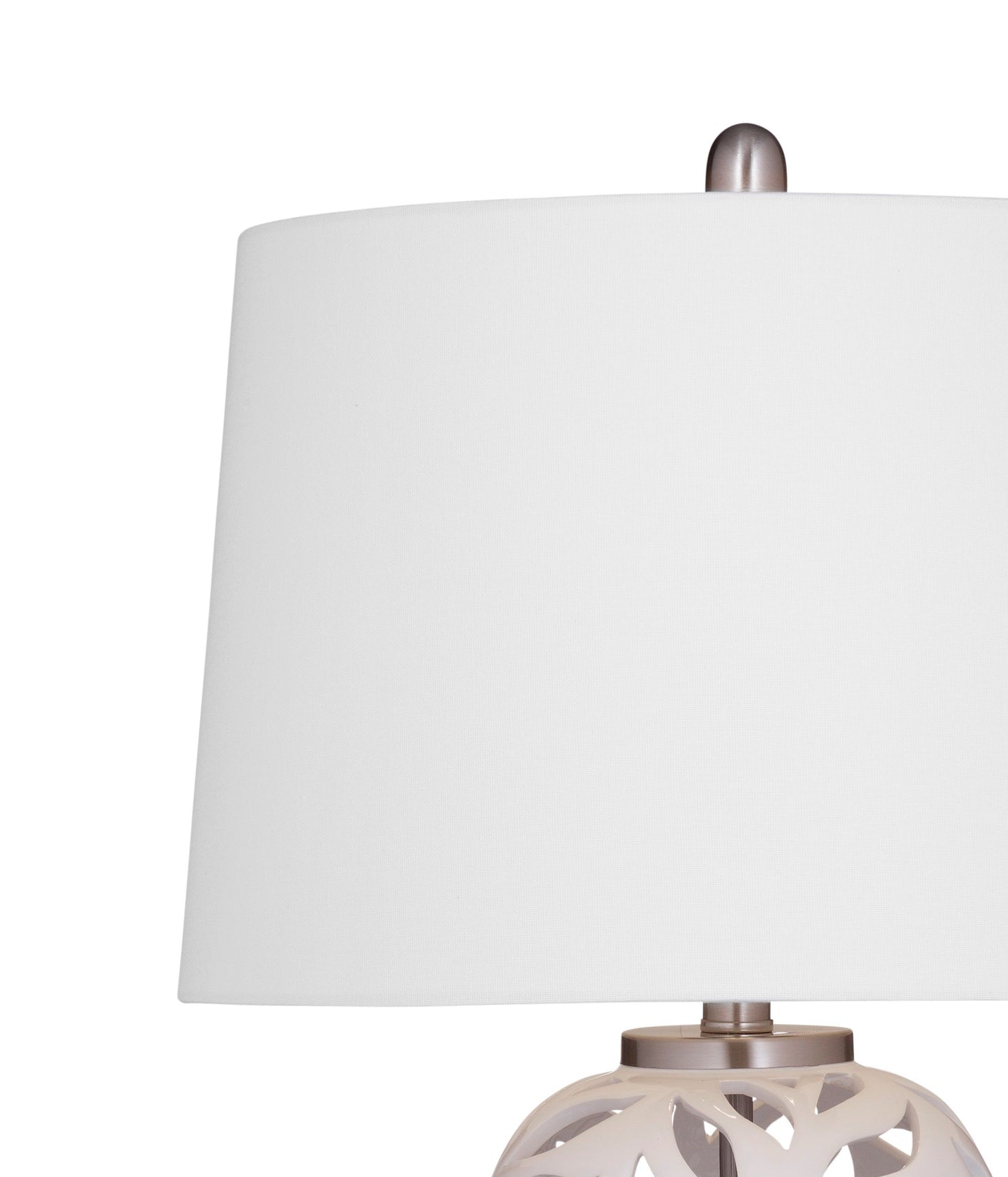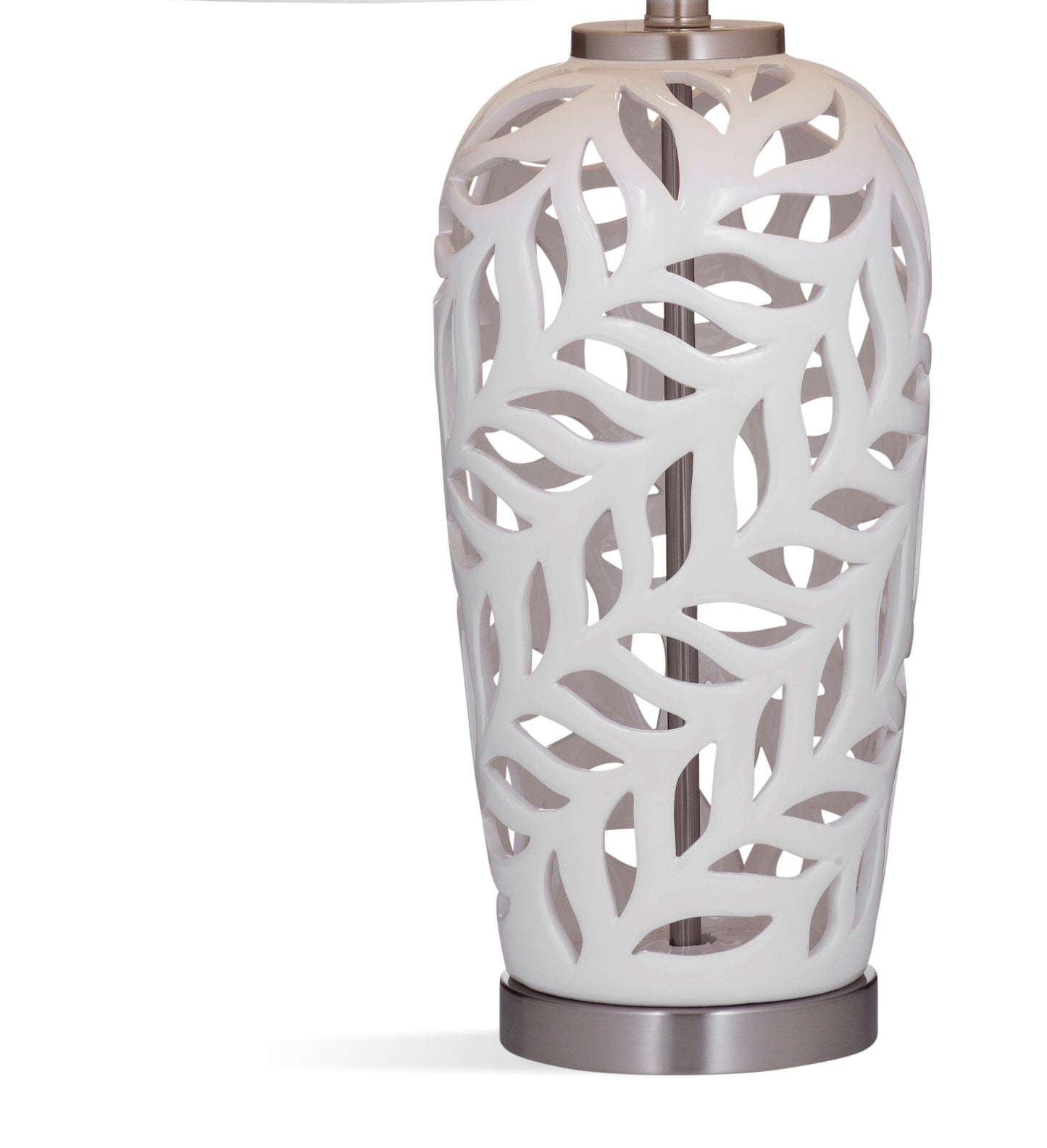 The Willow Table Lamp has a repetitive shaped foliage detail that wraps around the white ceramic body with a brushed nickel details and a white linen tapered shade.