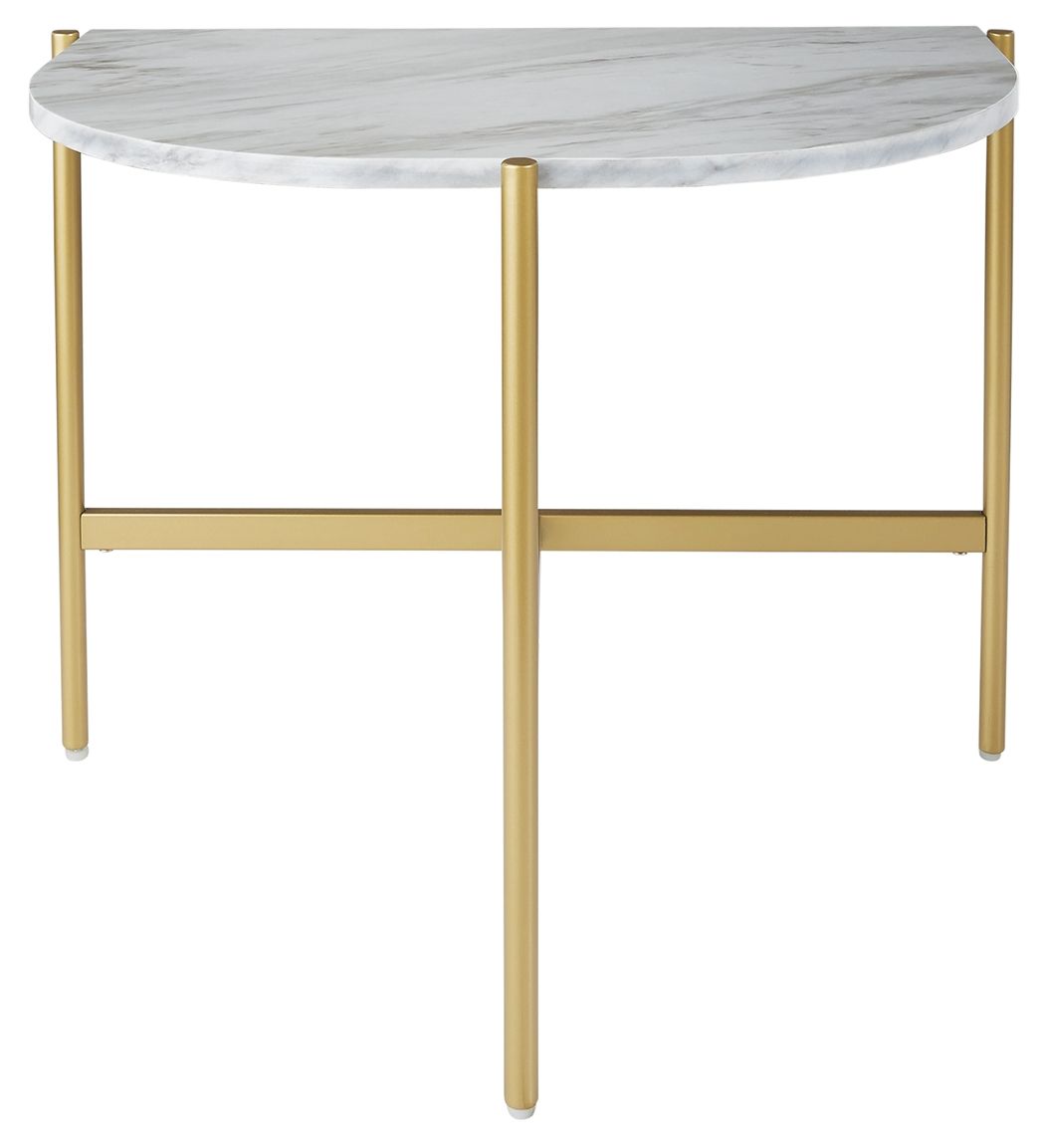 Add a bright spot to your contemporary space with this side table. The replicated Carrara marble top provides a chic sophistication while a goldtone finish on the metal frame heightens the modern aesthetic.